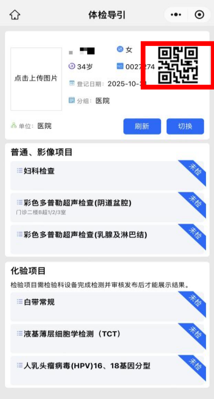 妇检当天,进入微信小程序“伟德体育官网医院师生端”,点击“体检导引”—→右上角“二维码”。持二维码至体检中心101室,扫码打印导检单与条码。